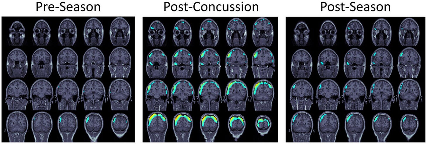 In the example below, MEG scans show delta brainwave activity in different stages of a concussed football player: pre-season (baseline), post-concussion (elevated activity indicating brain disruption), and post-season (partial recovery). Link