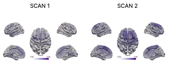 The image displays theta activity between two scans, with darker colors indicating higher levels of theta activity. Theta waves have been reported to be markers of neuroplasticity.