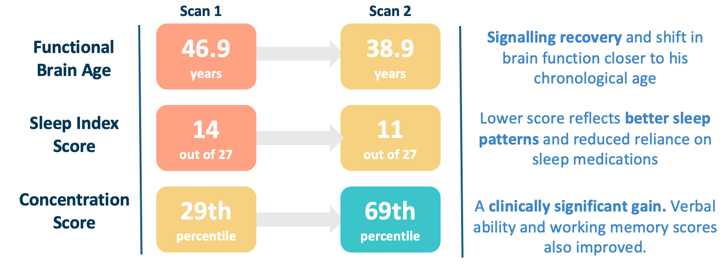 At the time of the first scan, the client's functional brain age was measured at 46.9 years - far above his chronological age. By the time of the second scan, this number had reduced to 38.9 years, indicating an improvement and a shift in brain function towards his chronological age.