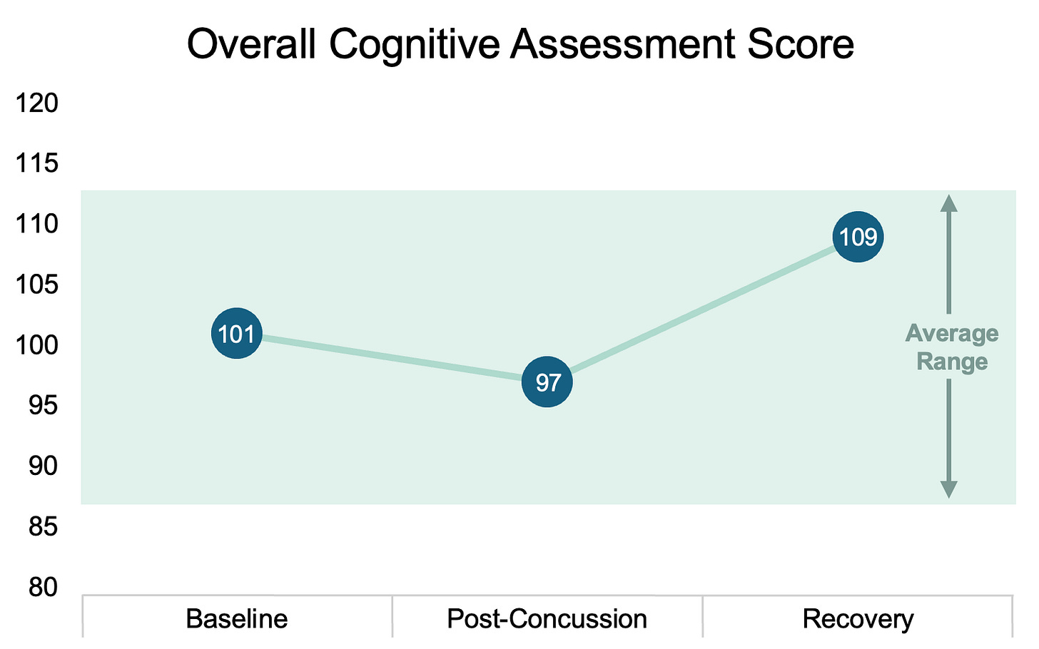 Cognitive Function: Clear cognitive recovery trajectory, with scores surpassing the post-concussion dip by the recovery phase, aligning with brain activity stabilization. This highlights the gradual improvement of cognitive function alongside neurological recovery.