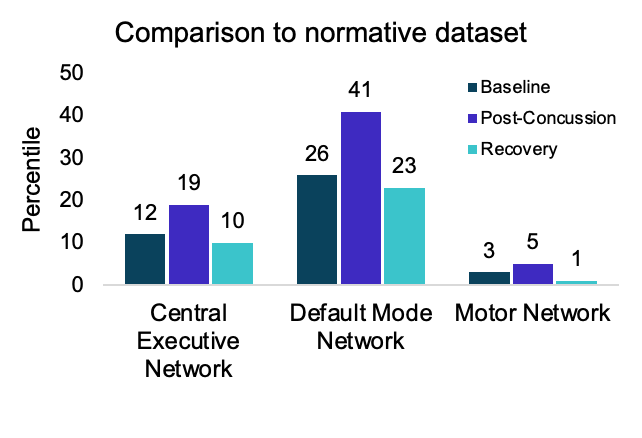 DMN Activity: Increased from the 26th percentile to the 41st percentile, reflecting disruptions in the brain’s default network. This increase is consistent with multiple studies (1,2,3), showing that functional connectivity tends to increase after a concussion. This hyper-connectivity may serve as a compensatory mechanism, helping mitigate the effects of concussion on cognition.